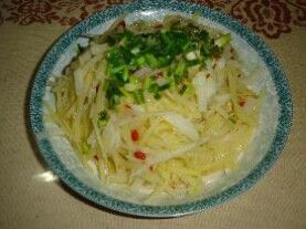 2.將熟的土豆比、山藥絲裝入容器內,加入適量的麻油、鹽、味精、胡椒粉、白醋、白糖、辣椒末拌勻裝入盤內,撒上蔥花。
